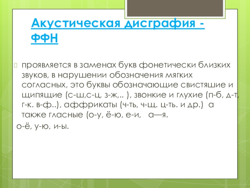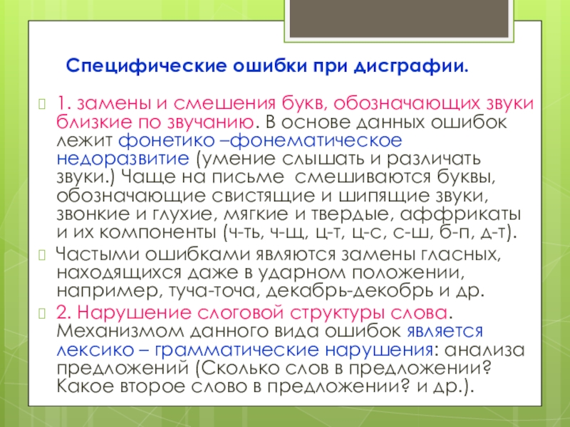 проявляется в заменах букв фонетически близких звуков, в нарушении