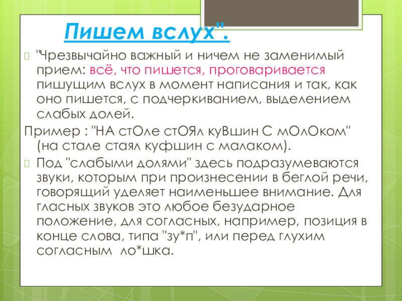пишется, проговаривается пишущим вслух в момент написания и так, как оно пишется, с подчеркиванием, выделением слабых долей.