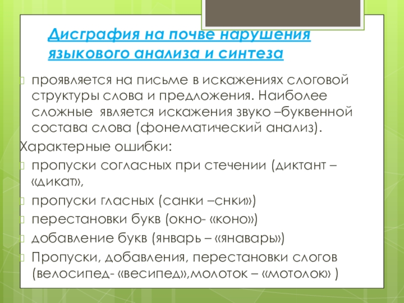 Слайд 7Дисграфия на почве нарушения языкового анализа и синтеза