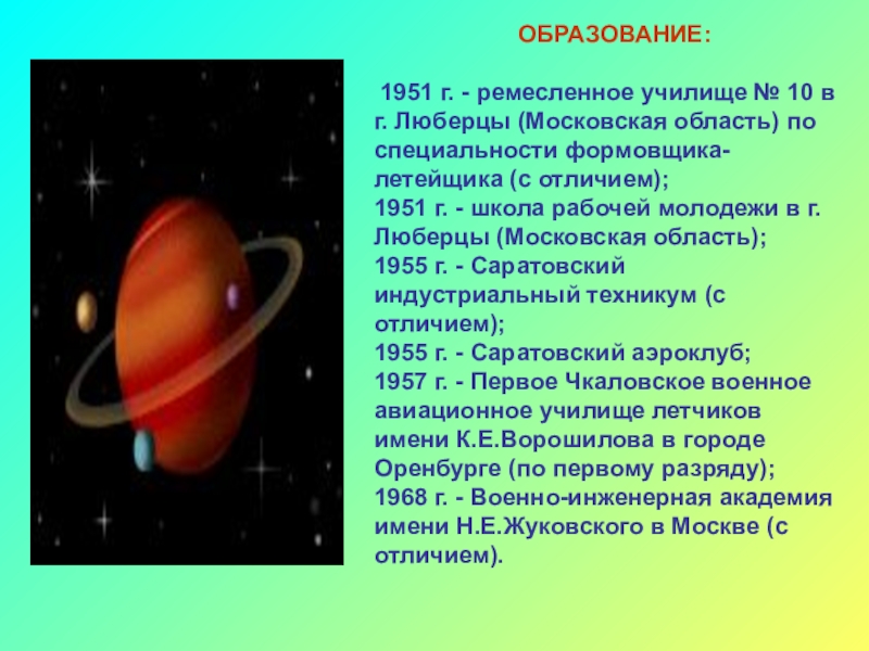 Сен. 1964 г. - 31 мая 1969 г. - слушатель инженерного факультета Военно-воздушной инженерной академии им. Н.Е. Жуковского. Окончила с отличием и получила квалификацию "летчик-космонавт-инженер".
