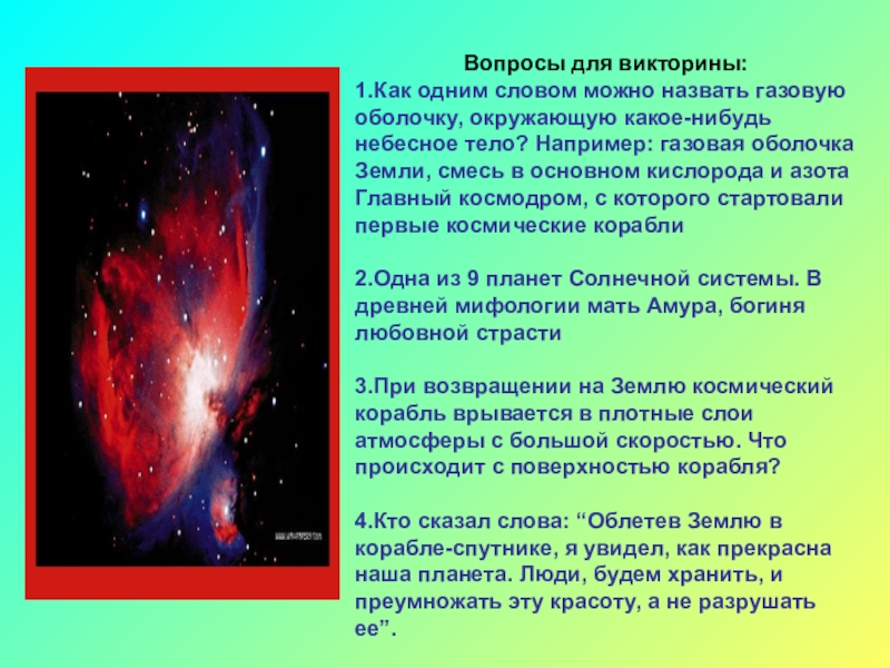 небесное тело? Например: газовая оболочка Земли, смесь в основном кислорода и азота Главный космодром, с которого стартовали первые космические корабли