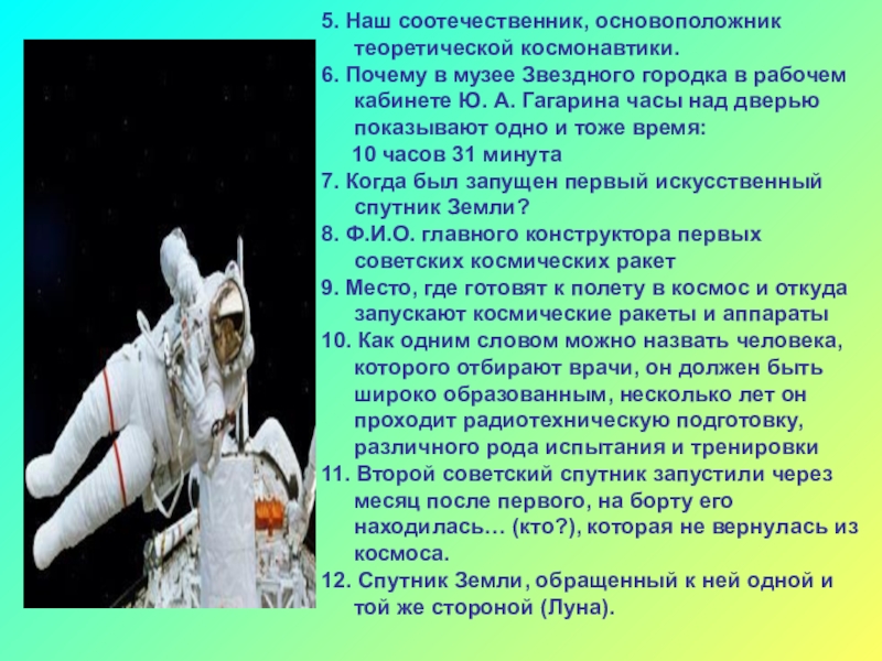 10. Как одним словом можно назвать человека, которого отбирают врачи, он должен быть широко образованным, несколько лет он проходит радиотехническую подготовку, различного рода испытания и тренировки