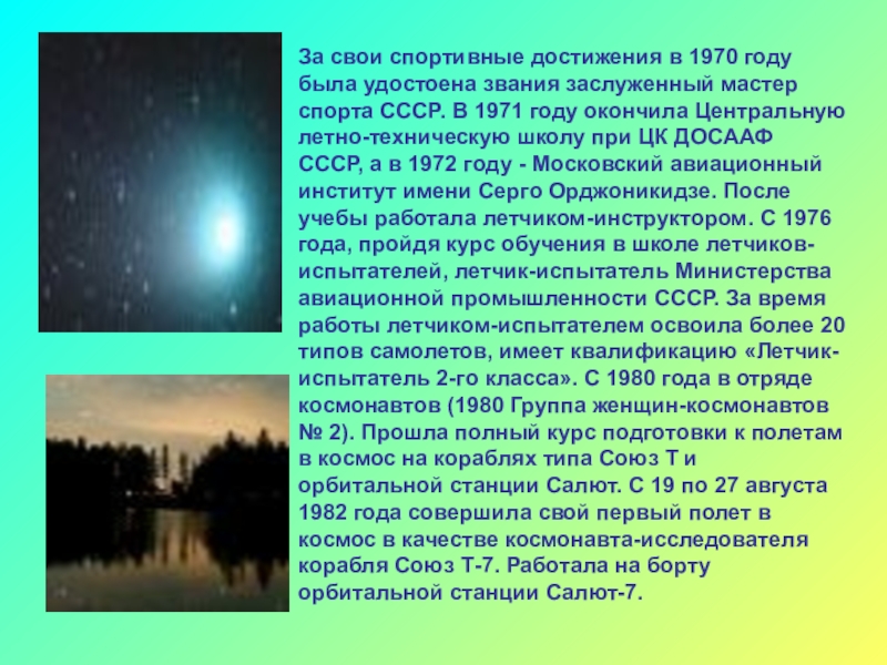 мастер спорта СССР. В 1971 году окончила Центральную летно-техническую школу при ЦК ДОСААФ СССР, а в 1972 году - Московский авиационный институт имени Серго Орджоникидзе. После учебы работала летчиком-инструктором. С 1976 года, пройдя курс обучения в школе летчиков-испытателей, летчик-испытатель Министерства авиационной промышленности СССР. За время работы летчиком-испытателем освоила более 20 типов самолетов, имеет квалификацию «Летчик-испытатель 2-го класса». С 1980 года в отряде космонавтов (1980 Группа женщин-космонавтов № 2). Прошла полный курс подготовки к полетам в космос на кораблях типа Союз Т и орбитальной станции Салют. С 19 по 27 августа 1982 года совершила свой первый полет в космос в качестве космонавта-исследователя корабля Союз Т-7. Работала на борту орбитальной станции Салют-7.