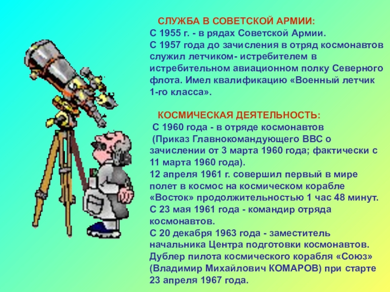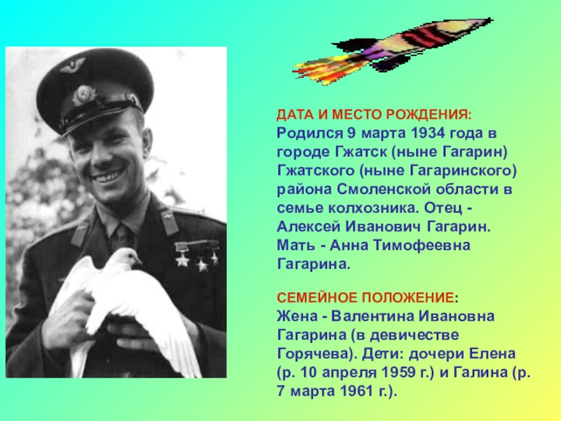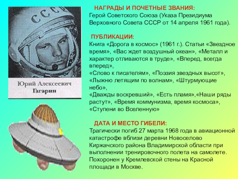 12 апреля 1961 г. совершил первый в мире полет в космос на космическом корабле «Восток» продолжительностью 1 час 48 минут.