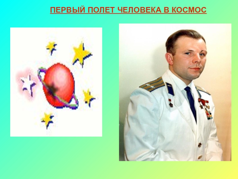 Слайд 1ПЕРВЫЙ ПОЛЕТ ЧЕЛОВЕКА В КОСМОС