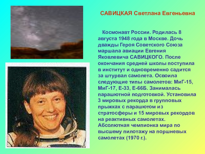 Москве. Дочь дважды Героя Советского Союза маршала авиации Евгения Яковлевича САВИЦКОГО. После окончания средней школы поступила в институт и одновременно садится за штурвал самолета. Освоила следующие типы самолетов: МиГ-15, МиГ-17, Е-33, Е-66Б. Занималась парашютной подготовкой. Установила 3 мировых рекорда в групповых прыжках с парашютом из стратосферы и 15 мировых рекордов на реактивных самолетах. Абсолютная чемпионка мира по высшему пилотажу на поршневых самолетах (1970 г.).