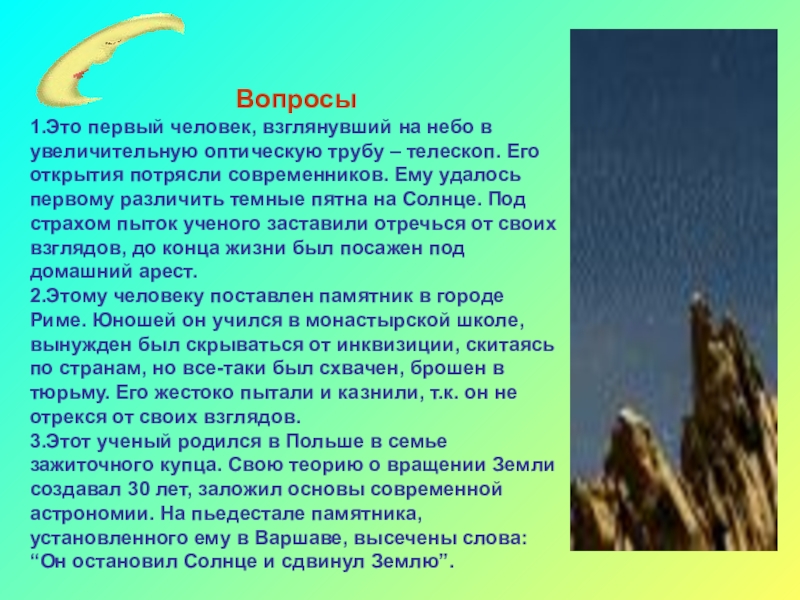 3.Этот ученый родился в Польше в семье зажиточного купца. Свою теорию о вращении Земли создавал 30 лет, заложил основы современной астрономии. На пьедестале памятника, установленного ему в Варшаве, высечены слова: “Он остановил Солнце и сдвинул Землю”.