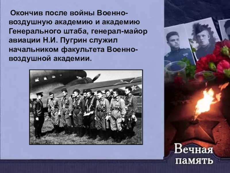 Окончив после войны Военно-воздушную академию и академию Генерального штаба, генерал-майор авиации Н.И. Пугрин служил начальником факультета Военно-воздушной академии.