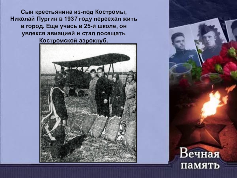 Сын крестьянина из-под Костромы, Николай Пургин в 1937 году переехал жить в город. Еще учась в 25-й школе, он увлекся авиацией и стал посещать Костромской аэроклуб.