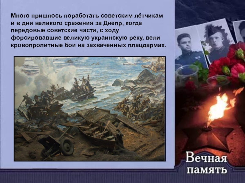 Много пришлось поработать советским лётчикам и в дни великого сражения за Днепр, когда передовые советские части, с ходу форсировавшие великую украинскую реку, вели кровопролитные бои на захваченных плацдармах.