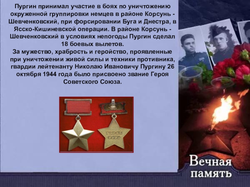 За мужество, храбрость и геройство, проявленные при уничтожении живой силы и техники противника, гвардии лейтенанту Николаю Ивановичу Пургину 26 октября 1944 года было присвоено звание Героя Советского Союза.
