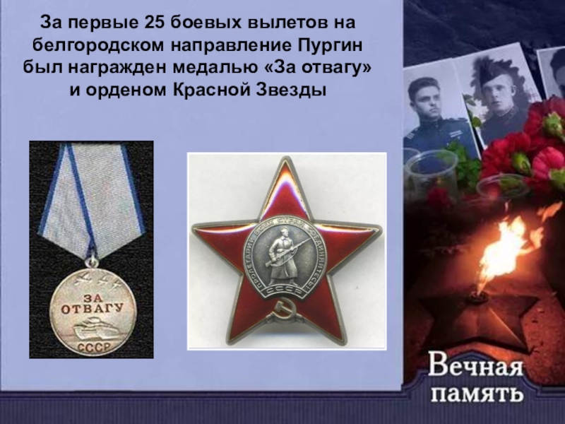 За первые 25 боевых вылетов на белгородском направление Пургин был награжден медалью «За отвагу» и орденом Красной Звезды