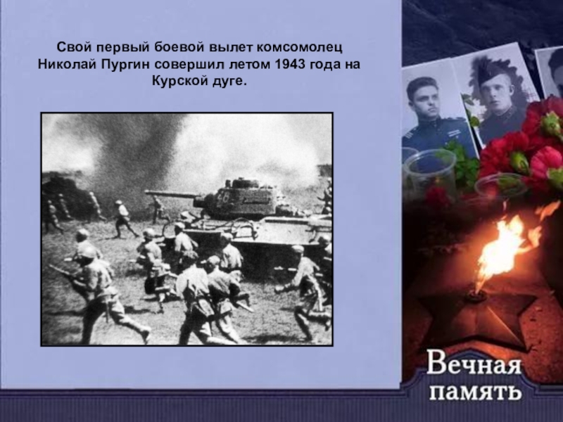 Свой первый боевой вылет комсомолец Николай Пургин совершил летом 1943 года на Курской дуге.