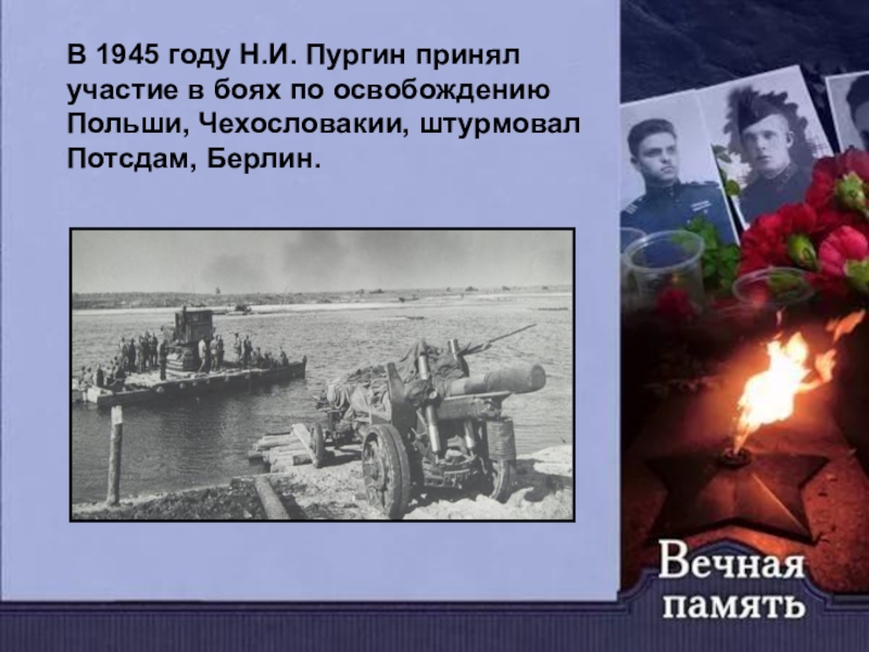 В 1945 году Н.И. Пургин принял участие в боях по освобождению Польши, Чехословакии, штурмовал Потсдам, Берлин.