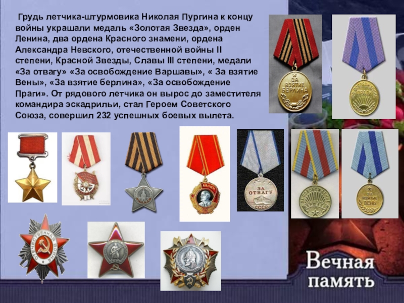 Грудь летчика-штурмовика Николая Пургина к концу войны украшали медаль «Золотая Звезда», орден Ленина, два ордена Красного знамени, ордена Александра Невского, отечественной войны II степени, Красной Звезды, Славы III степени, медали «За отвагу» «За освобождение Варшавы», « За взятие Вены», «За взятие берлина», «За освобождение Праги». От рядового летчика он вырос до заместителя командира эскадрильи, стал Героем Советского Союза, совершил 232 успешных боевых вылета.