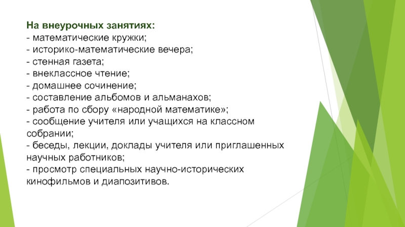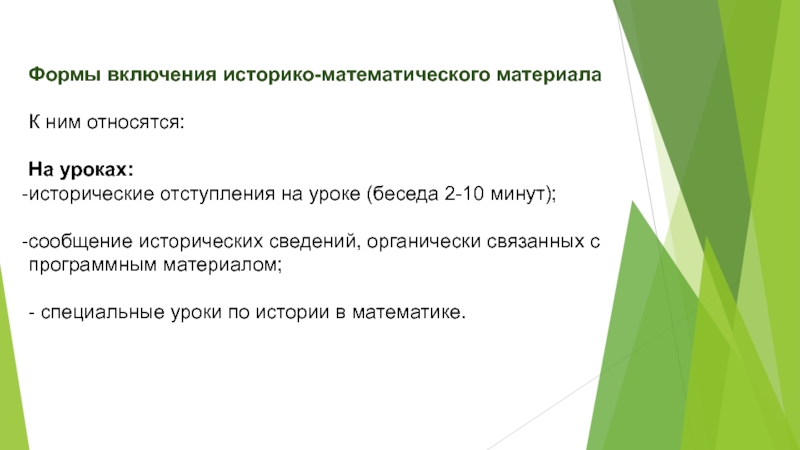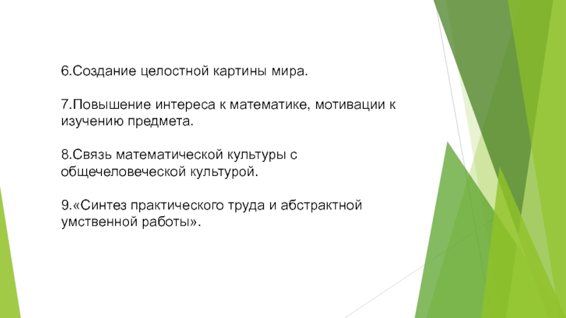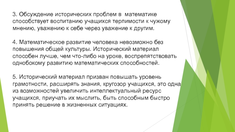 4. Математическое развитие человека невозможно без повышения общей культуры. Исторический материал способен лучше, чем что-либо на уроке, воспрепятствовать однобокому развитию математических способностей.