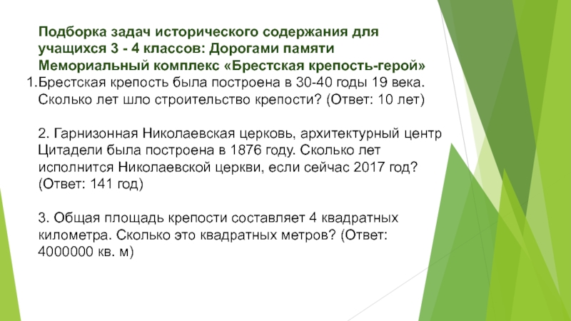 2. Гарнизонная Николаевская церковь, архитектурный центр Цитадели была построена в 1876 году. Сколько лет исполнится Николаевской церкви, если сейчас 2017 год? (Ответ: 141 год)