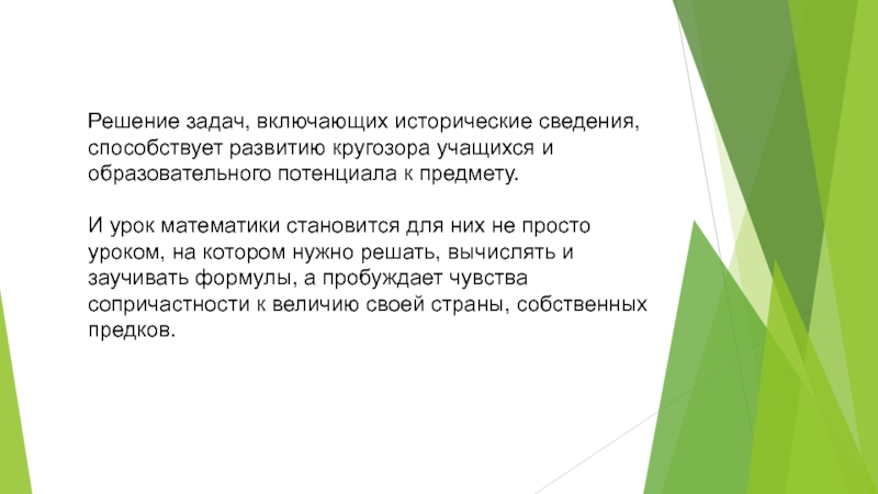 Слайд 15Решение задач, включающих исторические сведения, способствует развитию кругозора учащихся и образовательного