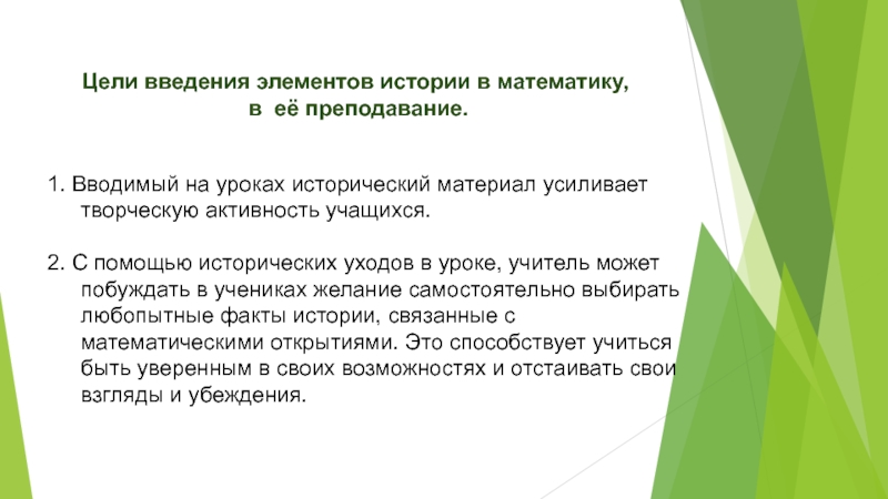 2. С помощью исторических уходов в уроке, учитель может побуждать в учениках желание самостоятельно выбирать любопытные факты истории, связанные с математическими открытиями. Это способствует учиться быть уверенным в своих возможностях и отстаивать свои взгляды и убеждения.