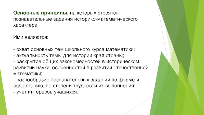Слайд 12Основные принципы, на которых строятся познавательные задания историко-математического характера.
