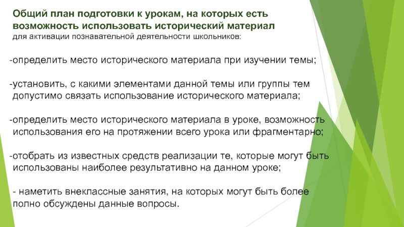 Слайд 9Общий план подготовки к урокам, на которых есть возможность использовать исторический