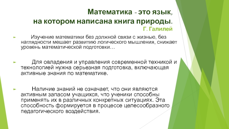 Изучение математики без должной связи с жизнью, без наглядности мешает развитию логического мышления, снижает уровень математической подготовки…