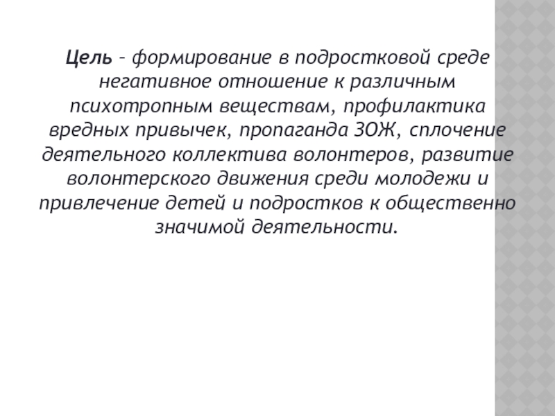 веществам, профилактика вредных привычек, пропаганда ЗОЖ, сплочение деятельного коллектива волонтеров, развитие волонтерского движения среди молодежи и привлечение детей и подростков к общественно значимой деятельности.
