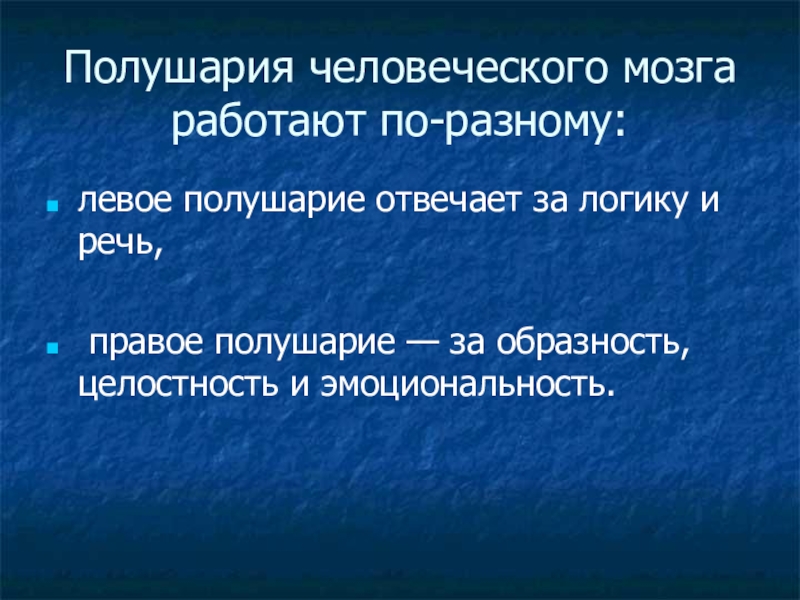 Слайд 2Полушария человеческого мозга работают по-разному: