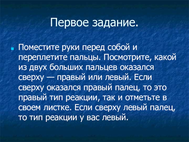 двух больших пальцев оказался сверху — правый или левый. Если сверху оказался правый палец, то это правый тип реакции, так и отметьте в своем листке. Если сверху левый палец, то тип реакции у вас левый.