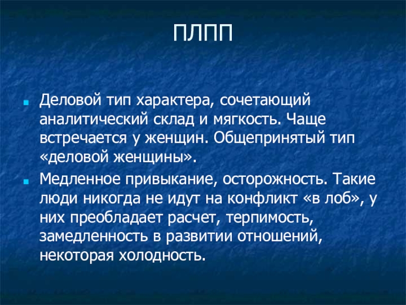 Деловой тип характера, сочетающий аналитический склад и мягкость. Чаще встречается у