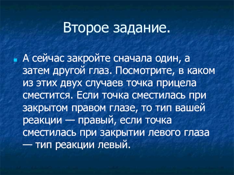в каком из этих двух случаев точка прицела сместится. Если точка сместилась при закрытом правом глазе, то тип вашей реакции — правый, если точка сместилась при закрытии левого глаза — тип реакции левый.