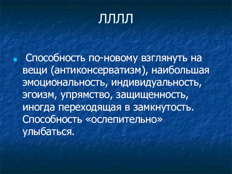 Способность по-новому взглянуть на вещи (антиконсерватизм), наибольшая эмоциональность, индивидуальность, эгоизм,