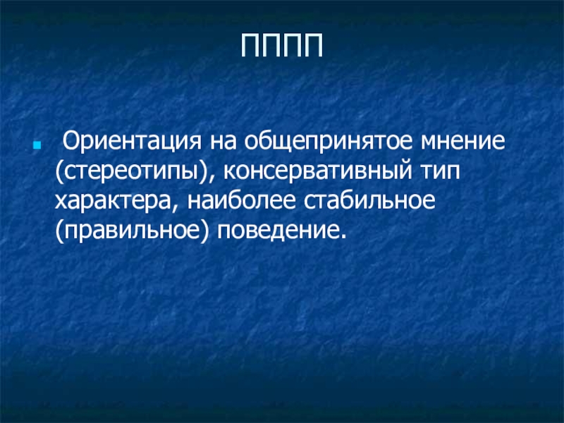 Ориентация на общепринятое мнение (стереотипы), консервативный тип характера, наиболее стабильное