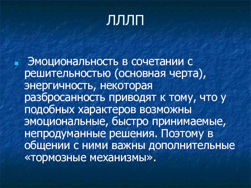 приводят к тому, что у подобных характеров возможны эмоциональные, быстро принимаемые, непродуманные решения. Поэтому в общении с ними важны дополнительные «тормозные механизмы».