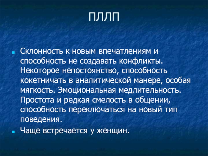 в сочетании с недостаточной настойчивостью, которая прежде всего проявляется в основных стратегических вопросах (брак, образование и т.п.). Высокая подверженность чужому влиянию. Легко контактирует со всеми остальными типами характера. У мужчин эмоциональность понижена, наблюдается склонность к флегматичности.
