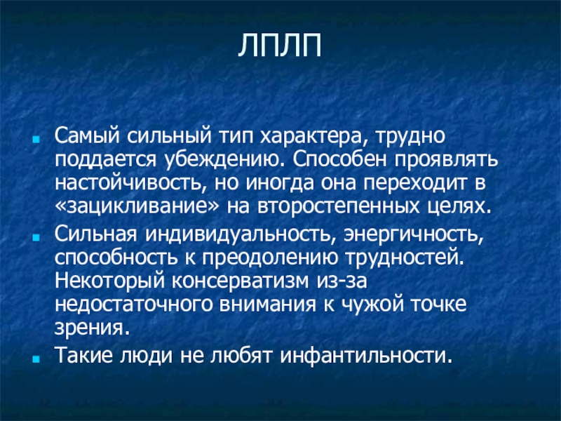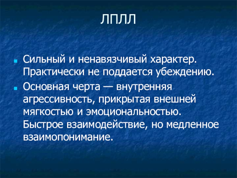 Самый сильный тип характера, трудно поддается убеждению. Способен проявлять настойчивость, но