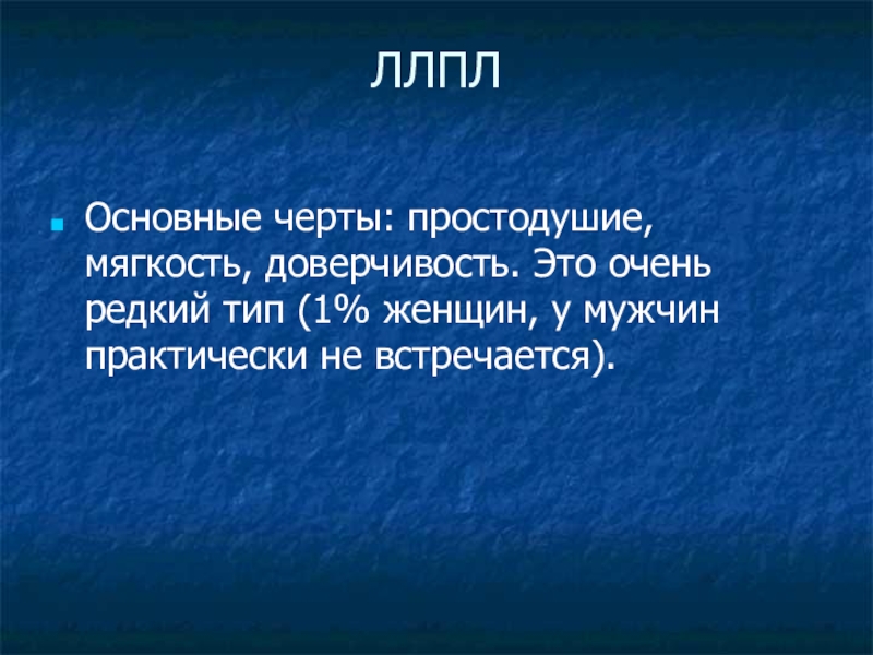 Основные черты: простодушие, мягкость, доверчивость. Это очень редкий тип (1% женщин,