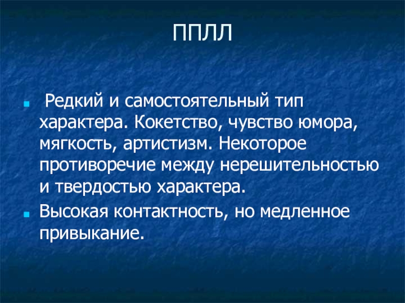 Редкий и самостоятельный тип характера. Кокетство, чувство юмора, мягкость, артистизм.