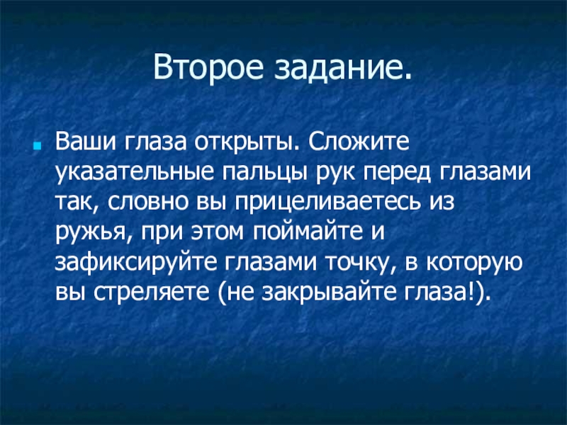 словно вы прицеливаетесь из ружья, при этом поймайте и зафиксируйте глазами точку, в которую вы стреляете (не закрывайте глаза!).