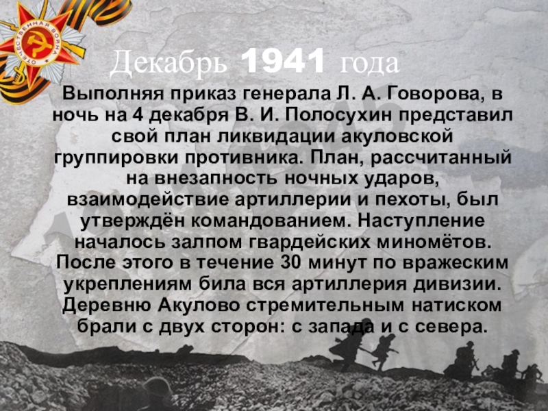 в ночь на 4 декабря В. И. Полосухин представил свой план ликвидации акуловской группировки противника. План, рассчитанный на внезапность ночных ударов, взаимодействие артиллерии и пехоты, был утверждён командованием. Наступление началось залпом гвардейских миномётов. После этого в течение 30 минут по вражеским укреплениям била вся артиллерия дивизии. Деревню Акулово стремительным натиском брали с двух сторон: с запада и с севера.