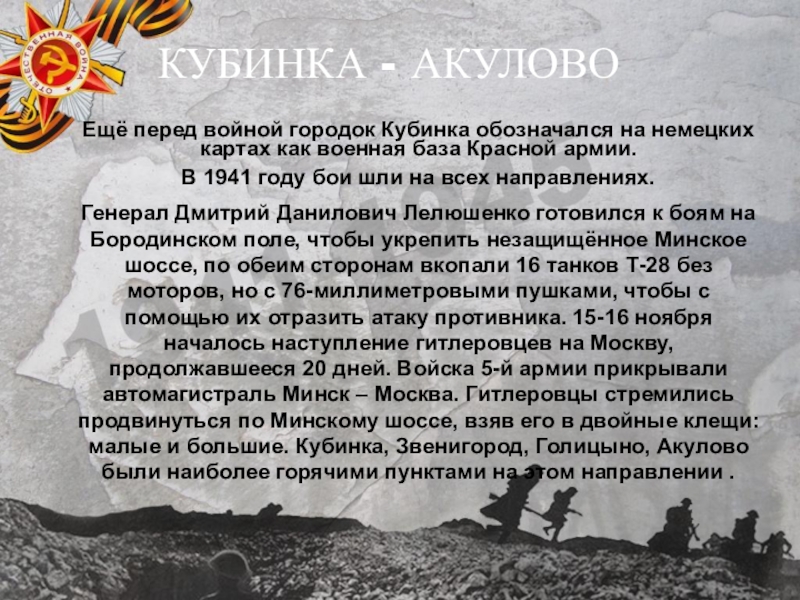 Генерал Дмитрий Данилович Лелюшенко готовился к боям на Бородинском поле, чтобы укрепить незащищённое Минское шоссе, по обеим сторонам вкопали 16 танков Т-28 без моторов, но с 76-миллиметровыми пушками, чтобы с помощью их отразить атаку противника. 15-16 ноября началось наступление гитлеровцев на Москву, продолжавшееся 20 дней. Войска 5-й армии прикрывали автомагистраль Минск – Москва. Гитлеровцы стремились продвинуться по Минскому шоссе, взяв его в двойные клещи: малые и большие. Кубинка, Звенигород, Голицыно, Акулово были наиболее горячими пунктами на этом направлении .