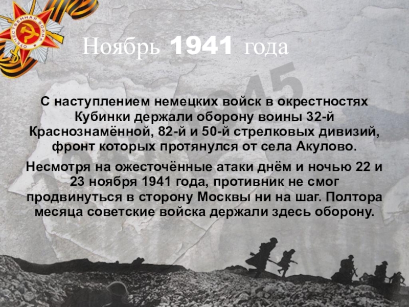 Кубинки держали оборону воины 32-й Краснознамённой, 82-й и 50-й стрелковых дивизий, фронт которых протянулся от села Акулово.
