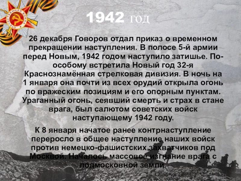 отдал приказ о временном прекращении наступления. В полосе 5-й армии перед Новым, 1942 годом наступило затишье. По-особому встретила Новый год 32-я Краснознамённая стрелковая дивизия. В ночь на 1 января она почти из всех орудий открыла огонь по вражеским позициям и его опорным пунктам. Ураганный огонь, сеявший смерть и страх в стане врага, был салютом советских войск наступающему 1942 году.