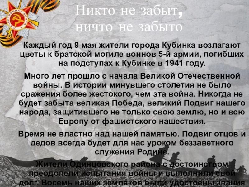 Время не властно над нашей памятью. Подвиг отцов и дедов всегда будет для нас уроком беззаветного служения Родине.
