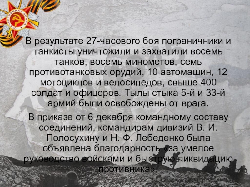 В приказе от 6 декабря командному составу соединений, командирам дивизий В. И. Полосухину и Н. Ф. Лебеденко была объявлена благодарность «за умелое руководство войсками и быструю ликвидацию противника».