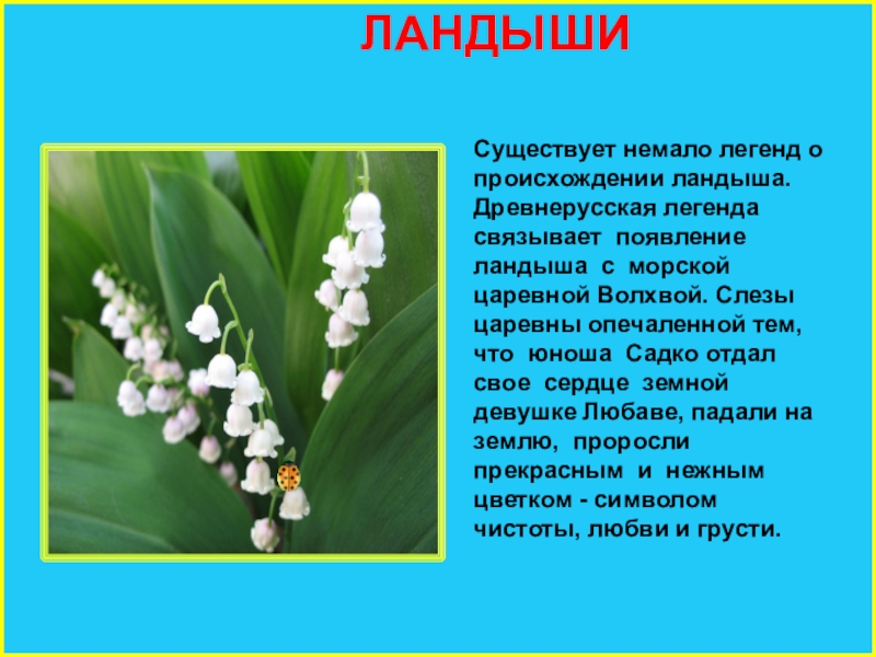 Существует немало легенд о происхождении ландыша. Древнерусская легенда связывает появление ландыша с морской царевной Волхвой. Слезы царевны опечаленной тем, что юноша Садко отдал свое сердце земной девушке Любаве, падали на землю, проросли прекрасным и нежным цветком - символом чистоты, любви и грусти.