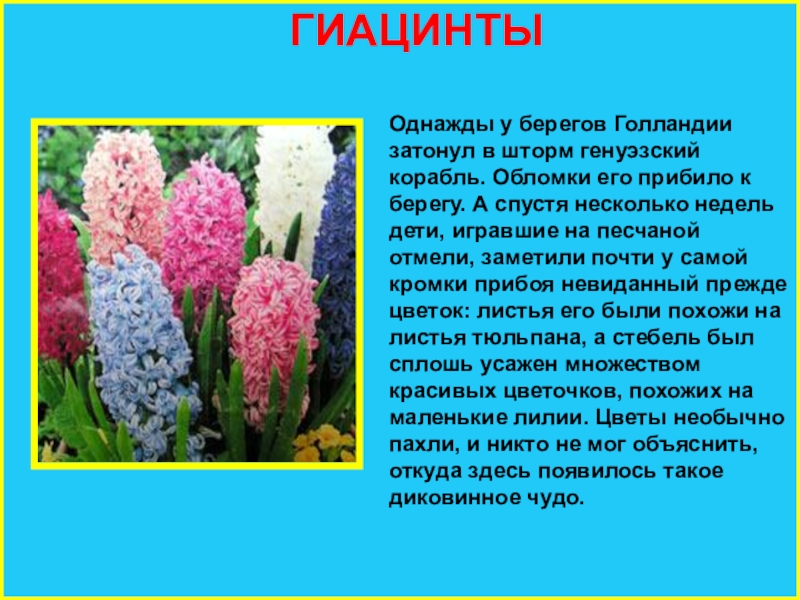 Однажды у берегов Голландии затонул в шторм генуэзский корабль. Обломки его прибило к берегу. А спустя несколько недель дети, игравшие на песчаной отмели, заметили почти у самой кромки прибоя невиданный прежде цветок: листья его были похожи на листья тюльпана, а стебель был сплошь усажен множеством красивых цветочков, похожих на маленькие лилии. Цветы необычно пахли, и никто не мог объяснить, откуда здесь появилось такое диковинное чудо.