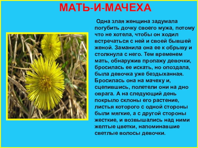 Одна злая женщина задумала погубить дочку своего мужа, потому что не хотела, чтобы он ходил встречаться с ней и своей бывшей женой. Заманила она ее к обрыву и столкнула с него. Тем временем мать, обнаружив пропажу девочки, бросилась ее искать, но опоздала, была девочка уже бездыханная. Бросилась она на мачеху и, сцепившись, полетели они на дно оврага. А на следующий день покрыло склоны его растение, листья которого с одной стороны были мягкие, а с другой стороны жесткие, и возвышались над ними желтые цветки, напоминавшие светлые волосы девочки.