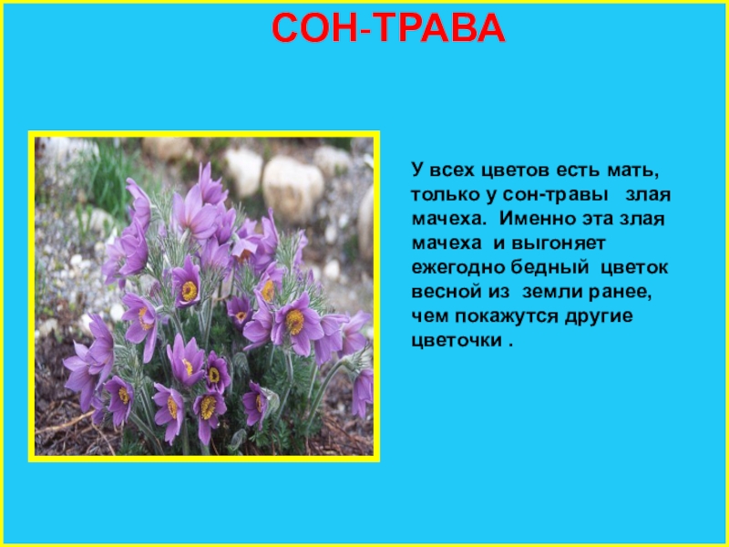 У всех цветов есть мать, только у сон-травы злая мачеха. Именно эта злая мачеха и выгоняет ежегодно бедный цветок весной из земли ранее, чем покажутся другие цветочки .