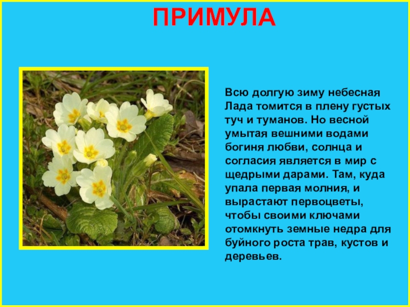 Всю долгую зиму небесная Лада томится в плену густых туч и туманов. Но весной умытая вешними водами богиня любви, солнца и согласия является в мир с щедрыми дарами. Там, куда упала первая молния, и вырастают первоцветы, чтобы своими ключами отомкнуть земные недра для буйного роста трав, кустов и деревьев.